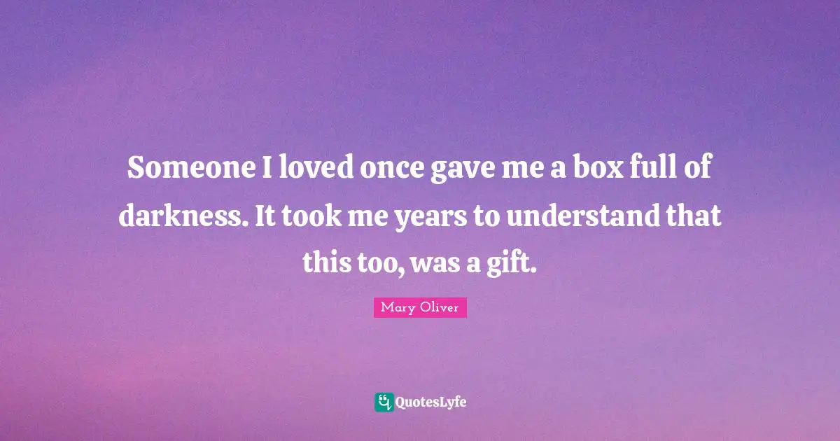 This page presents the quote "Someone I loved once gave me a box full of darkness. It took me years to understand that this too, was a gift.". Author of this quote is Mary Oliver. This quote is about box, gift, love, darkness, affection,.