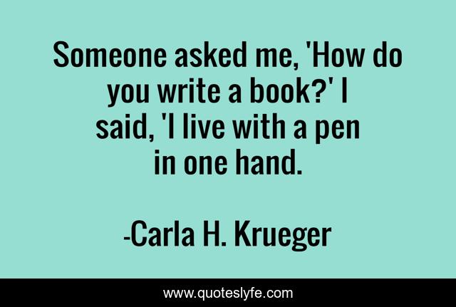 This page presents the quote "Someone asked me, 'How do you write a book?' I said, 'I live with a pen in one hand.". Author of this quote is Carla H. Krueger. This quote is about writing-life, writing-books, writing-tips, writing-process, carla-h-krueger, writers, writers-on-writing, writing-advice,.