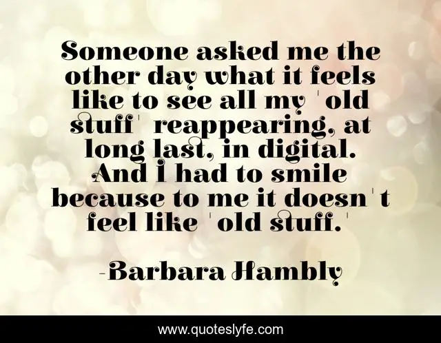 This page presents the quote "Someone asked me the other day what it feels like to see all my 'old stuff' reappearing, at long last, in digital. And I had to smile because to me it doesn't feel like 'old stuff.'". Author of this quote is Barbara Hambly. This quote is about me, day, long,.