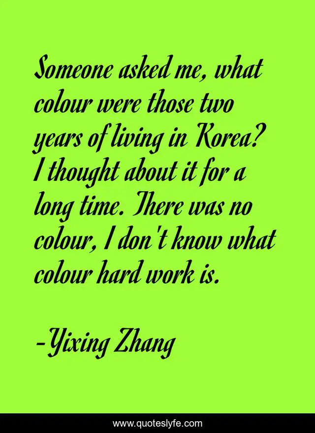 This page presents the quote "Someone asked me, what colour were those two years of living in Korea? I thought about it for a long time. There was no colour, I don't know what colour hard work is.". Author of this quote is Yixing Zhang. This quote is about colour, hard-work,.