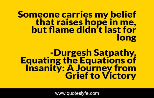 This page presents the quote "Someone carries my belief that raises hope in me, but flame didn’t last for long". Author of this quote is Durgesh Satpathy, Equating the Equations of Insanity: A Journey from Grief to Victory. This quote is about solitary, life, love, psychological-abuse, hurt, grief, affection,.