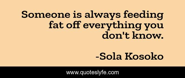 "Sola Kosoko Quotes." Quoteslyfe.com, 2025. Sat. 06 Dec. 2025. <https://www.quoteslyfe.com/quote/Someone-is-always-feeding-fat-off-everything-33235>.
