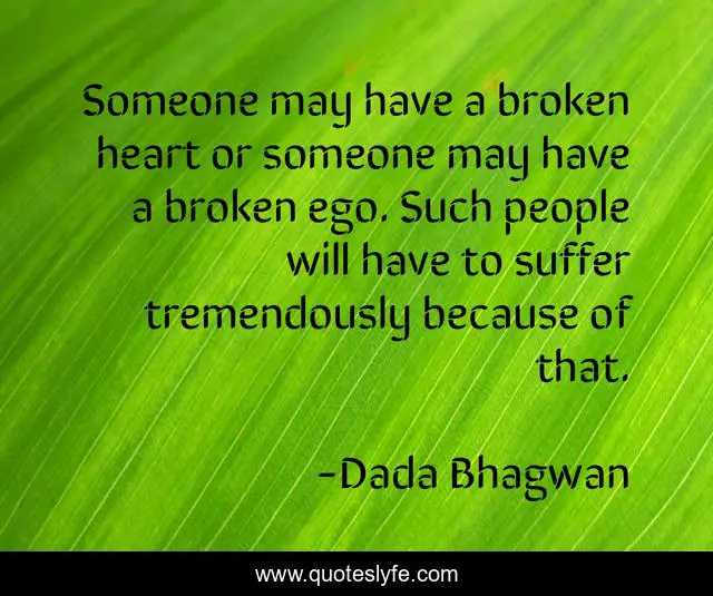 This page presents the quote "Someone may have a broken heart or someone may have a broken ego. Such people will have to suffer tremendously because of that.". Author of this quote is Dada Bhagwan. This quote is about heart, spiritual, ego, egoism,.
