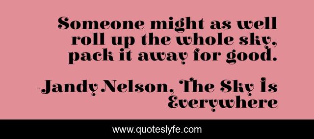 This page presents the quote "Someone might as well roll up the whole sky, pack it away for good.". Author of this quote is Jandy Nelson, The Sky Is Everywhere. This quote is about grief, jandy-nelson, the-sky-is-everywhere, sky,.