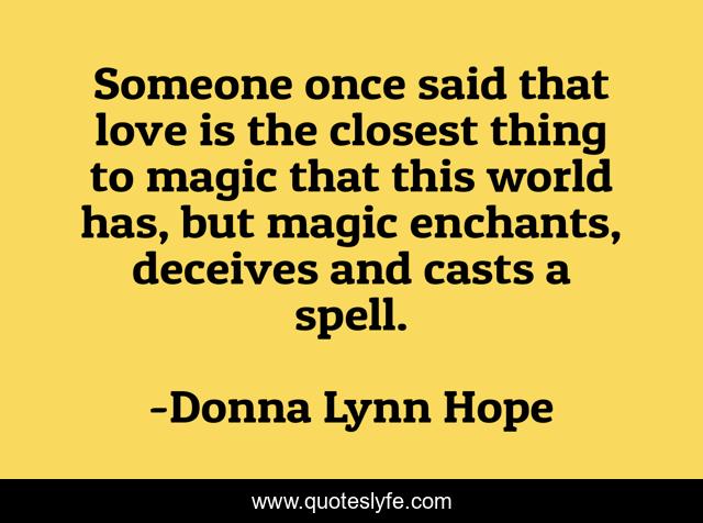 This page presents the quote "Someone once said that love is the closest thing to magic that this world has, but magic enchants, deceives and casts a spell.". Author of this quote is Donna Lynn Hope. This quote is about deceives, magic, love, affection, deception,.