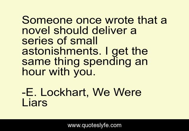 This page presents the quote "Someone once wrote that a novel should deliver a series of small astonishments. I get the same thing spending an hour with you.". Author of this quote is E. Lockhart, We Were Liars. This quote is about books, love, affection,.