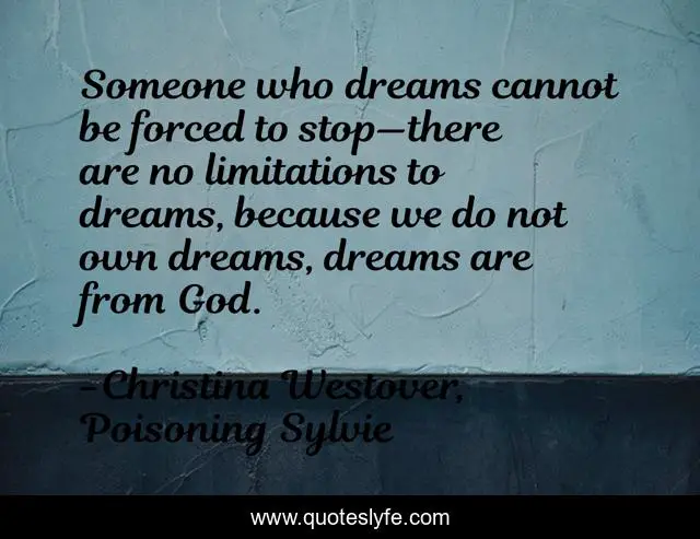 This page presents the quote "Someone who dreams cannot be forced to stop—there are no limitations to dreams, because we do not own dreams, dreams are from God.". Author of this quote is Christina Westover, Poisoning Sylvie. This quote is about christina-westover, visionary, literary, dreamers, inspirational, enthusiasm, poisoning-sylvie, women-s-fiction, dreams,.