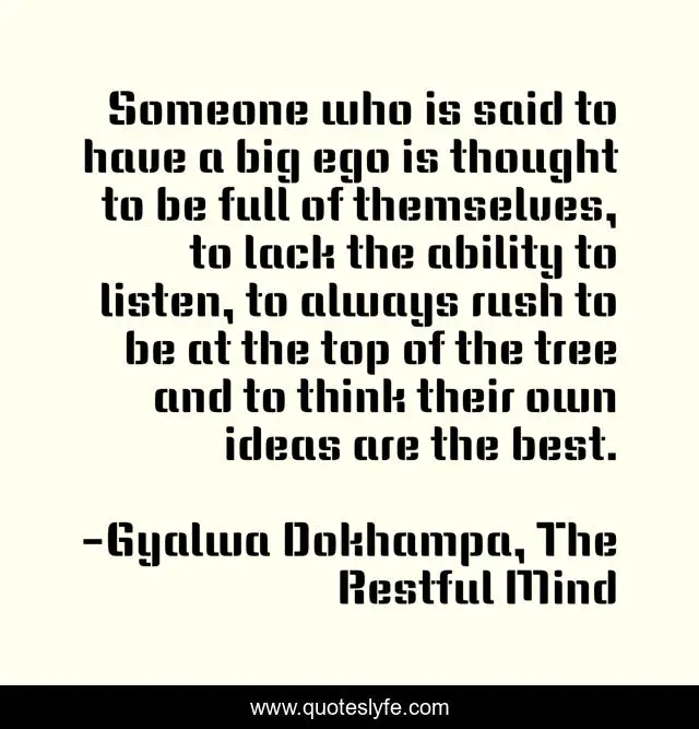 This page presents the quote "Someone who is said to have a big ego is thought to be full of themselves, to lack the ability to listen, to always rush to be at the top of the tree and to think their own ideas are the best.". Author of this quote is Gyalwa Dokhampa, The Restful Mind. This quote is about self, pride, ego, egoism,.