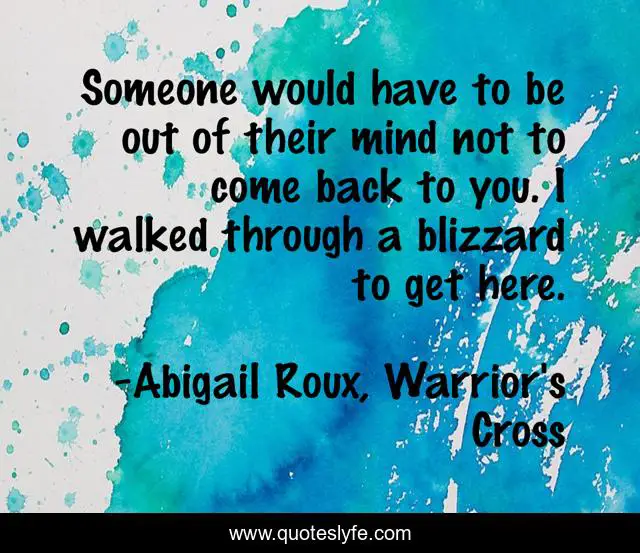 This page presents the quote "Someone would have to be out of their mind not to come back to you. I walked through a blizzard to get here.". Author of this quote is Abigail Roux, Warrior's Cross. This quote is about sweet, swoon, romantic,.