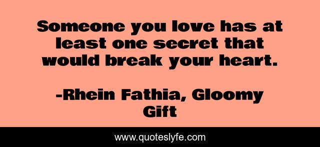 This page presents the quote "Someone you love has at least one secret that would break your heart.". Author of this quote is Rhein Fathia, Gloomy Gift. This quote is about broken-heart, love, affection, romance-novels,.