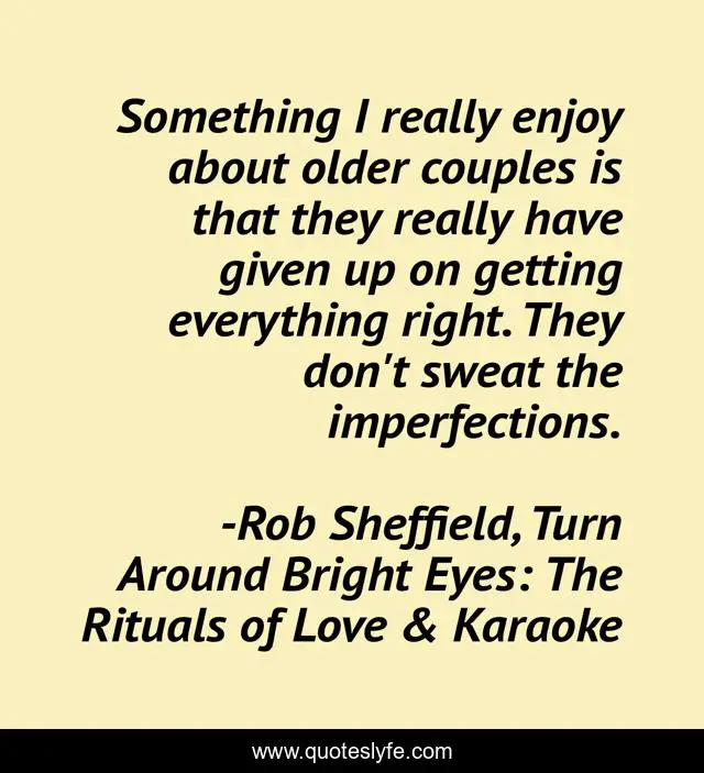This page presents the quote "Something I really enjoy about older couples is that they really have given up on getting everything right. They don't sweat the imperfections.". Author of this quote is Rob Sheffield, Turn Around Bright Eyes: The Rituals of Love & Karaoke. .