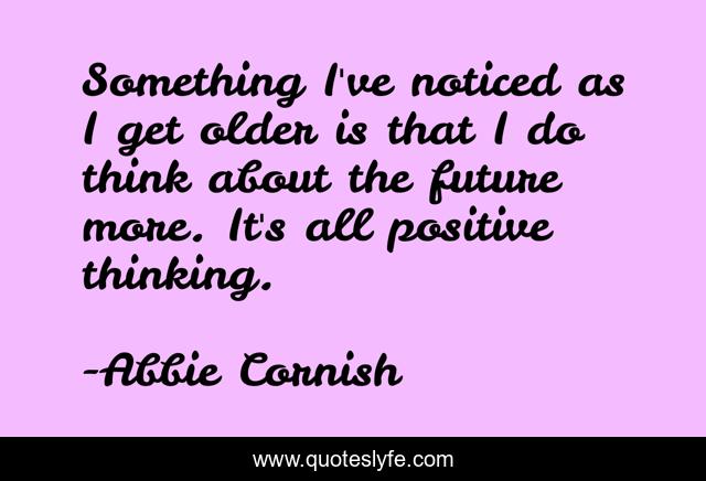 This page presents the quote "Something I've noticed as I get older is that I do think about the future more. It's all positive thinking.". Author of this quote is Abbie Cornish. This quote is about thinking, future, think,.