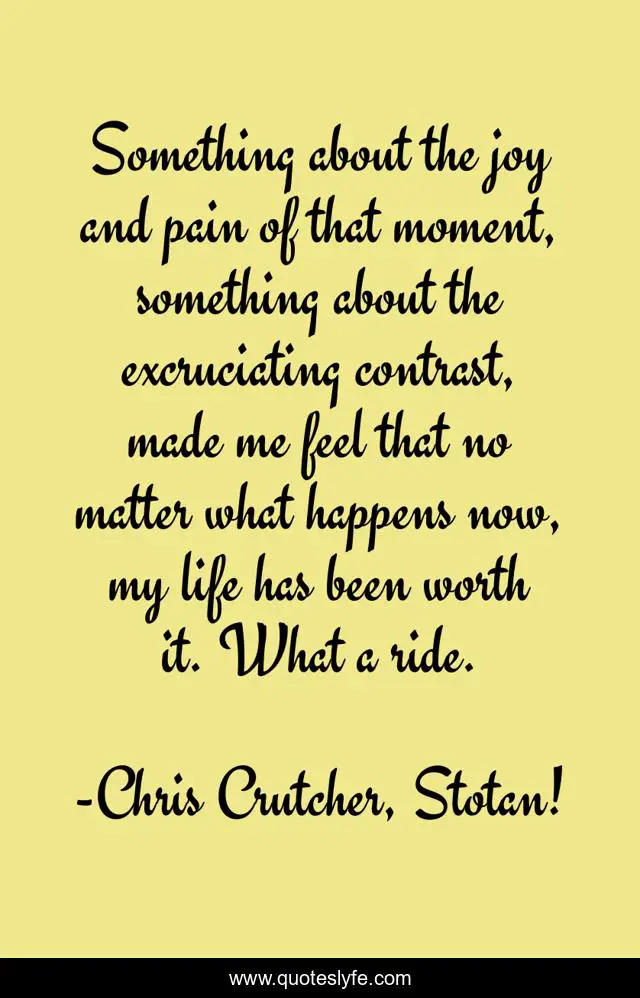 This page presents the quote "Something about the joy and pain of that moment, something about the excruciating contrast, made me feel that no matter what happens now, my life has been worth it. What a ride.". Author of this quote is Chris Crutcher, Stotan!. This quote is about life, fulfillment, experience, triumph,.