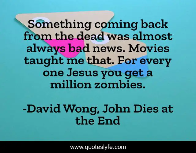 This page presents the quote "Something coming back from the dead was almost always bad news. Movies taught me that. For every one Jesus you get a million zombies.". Author of this quote is David Wong, John Dies at the End. This quote is about revenant, zombies, undead,.