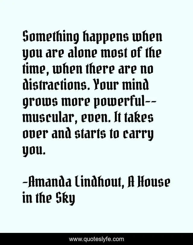 This page presents the quote "Something happens when you are alone most of the time, when there are no distractions. Your mind grows more powerful--muscular, even. It takes over and starts to carry you.". Author of this quote is Amanda Lindhout, A House in the Sky. .