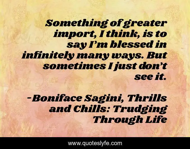 This page presents the quote "Something of greater import, I think, is to say I’m blessed in infinitely many ways. But sometimes I just don’t see it.". Author of this quote is Boniface Sagini, Thrills and Chills: Trudging Through Life. This quote is about blessings, thrills-and-chills, blessed, boniface-sagini,.