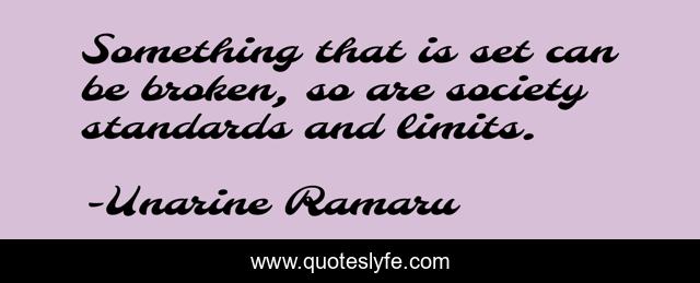 This page presents the quote "Something that is set can be broken, so are society standards and limits.". Author of this quote is Unarine Ramaru. This quote is about urge, limits, aim-high, drive, social-standards, goals, postive-thinking, goal-setting,.