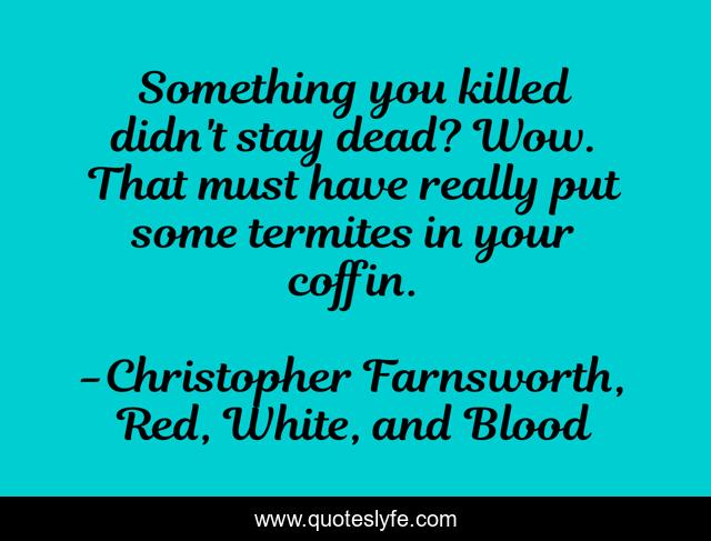 This page presents the quote "Something you killed didn't stay dead? Wow. That must have really put some termites in your coffin.". Author of this quote is Christopher Farnsworth, Red, White, and Blood. This quote is about boogeyman, humor, vampires, paranormal-suspense,.