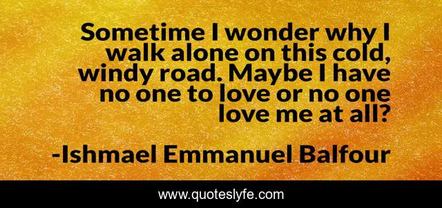 This page presents the quote "Sometime I wonder why I walk alone on this cold, windy road. Maybe I have no one to love or no one love me at all?". Author of this quote is Ishmael Emmanuel Balfour. This quote is about life, love, windy, road, alone, cold, affection, wonder,.