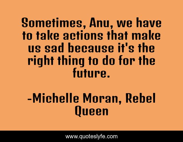 This page presents the quote "Sometimes, Anu, we have to take actions that make us sad because it's the right thing to do for the future.". Author of this quote is Michelle Moran, Rebel Queen. This quote is about future, decisions, choices,.