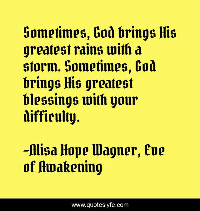 "Alisa Hope Wagner, Eve of Awakening Quotes." Quoteslyfe.com, 2025. Mon. 08 Dec. 2025. <https://www.quoteslyfe.com/quote/Sometimes-God-brings-His-greatest-rains-with-240904>.