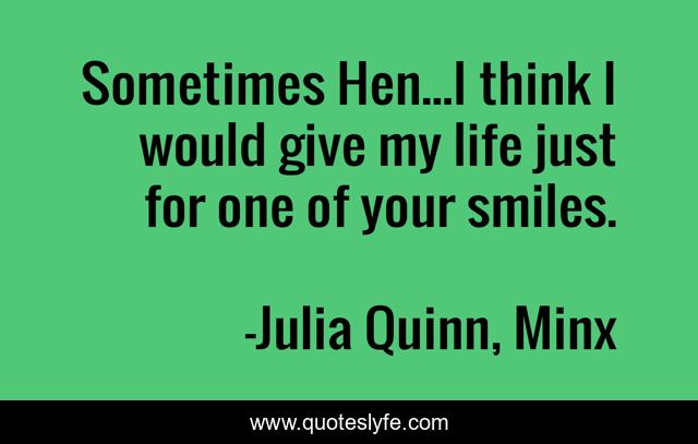 This page presents the quote "Sometimes Hen...I think I would give my life just for one of your smiles.". Author of this quote is Julia Quinn, Minx. This quote is about smiles, minx, love, bridgertons, dunford, regency, romance, julia-quinn, affection,.