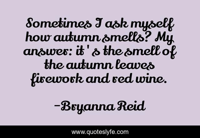 This page presents the quote "Sometimes I ask myself how autumn smells? My answer: it's the smell of the autumn leaves firework and red wine.". Author of this quote is Bryanna Reid. This quote is about autumn, blues, mood, lyrics, wine,.