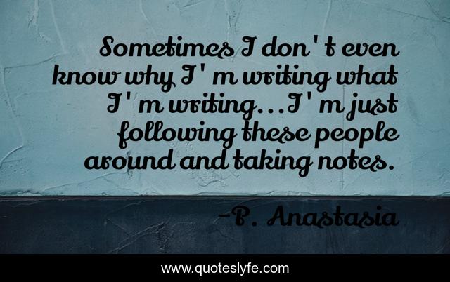 This page presents the quote "Sometimes I don't even know why I'm writing what I'm writing...I'm just following these people around and taking notes.". Author of this quote is P. Anastasia. This quote is about humor, blogs, writer, writing, being-a-writer, novelist,.