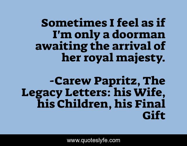 This page presents the quote "Sometimes I feel as if I'm only a doorman awaiting the arrival of her royal majesty.". Author of this quote is Carew Papritz, The Legacy Letters: his Wife, his Children, his Final Gift. This quote is about woman, man-and-woman, quote, female, doorman, royal-majesty,.