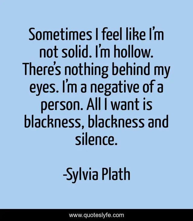 This page presents the quote "Sometimes I feel like I’m not solid. I’m hollow. There’s nothing behind my eyes. I’m a negative of a person. All I want is blackness, blackness and silence.". Author of this quote is Sylvia Plath. .
