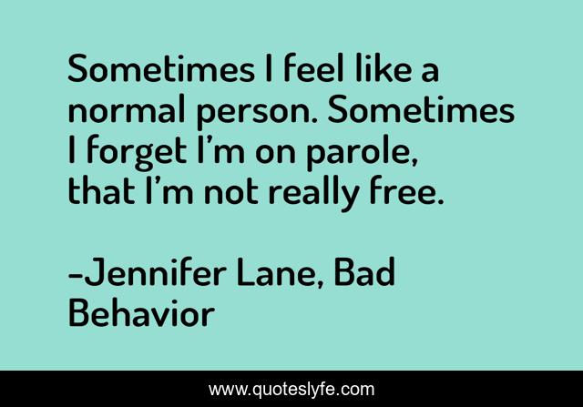This page presents the quote "Sometimes I feel like a normal person. Sometimes I forget I’m on parole, that I’m not really free.". Author of this quote is Jennifer Lane, Bad Behavior. This quote is about convicts, grant-madsen, prison, crime, romance, sophie-taylor, romantic-suspense, navy, family-drama,.