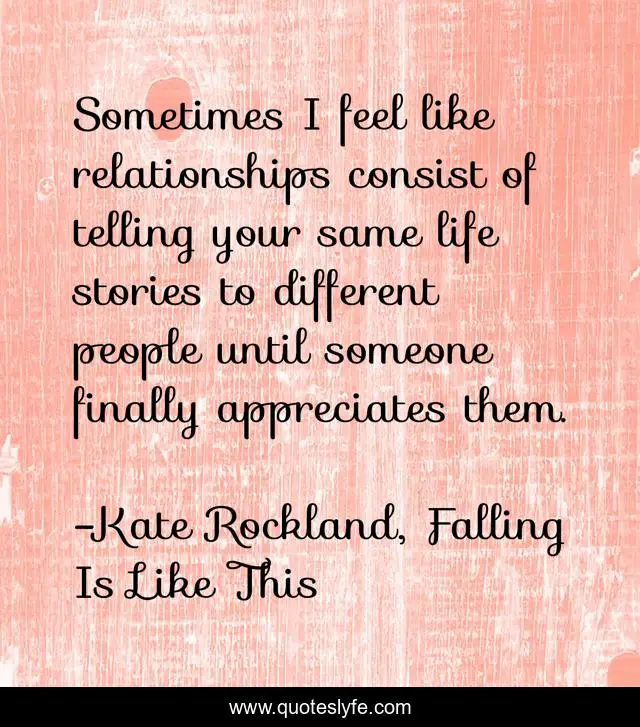 This page presents the quote "Sometimes I feel like relationships consist of telling your same life stories to different people until someone finally appreciates them.". Author of this quote is Kate Rockland, Falling Is Like This. This quote is about relationships, appreciation, life-story,.