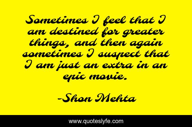 This page presents the quote "Sometimes I feel that I am destined for greater things, and then again sometimes I suspect that I am just an extra in an epic movie.". Author of this quote is Shon Mehta. This quote is about self-discovery, shonology, identity,.