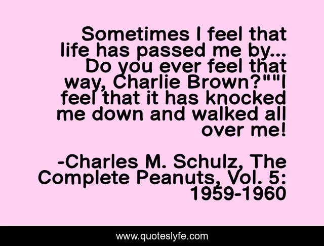 This page presents the quote "Sometimes I feel that life has passed me by... Do you ever feel that way, Charlie Brown?""I feel that it has knocked me down and walked all over me!". Author of this quote is Charles M. Schulz, The Complete Peanuts, Vol. 5: 1959-1960. .