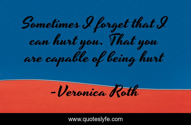 This page presents the quote "Sometimes I forget that I can hurt you. That you are capable of being hurt". Author of this quote is Veronica Roth. This quote is about four, roth, tobias, tris, hurt,.