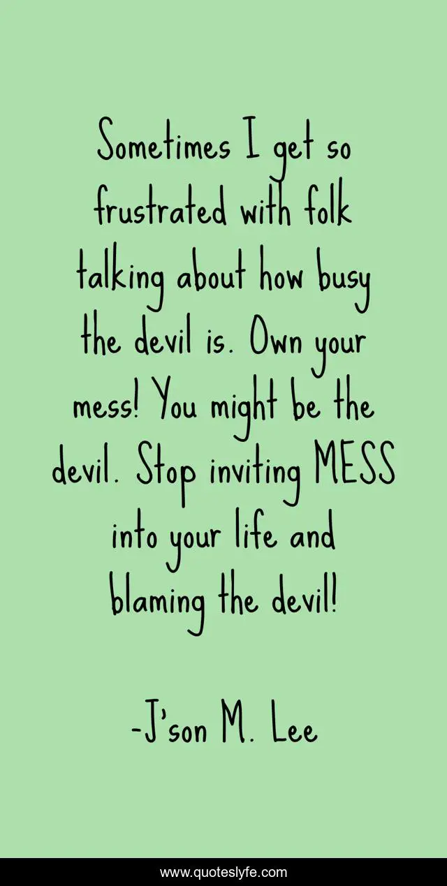 This page presents the quote "Sometimes I get so frustrated with folk talking about how busy the devil is. Own your mess! You might be the devil. Stop inviting MESS into your life and blaming the devil!". Author of this quote is J'son M. Lee. This quote is about devil, god, religion, inspirational, god-s-will, enthusiasm,.