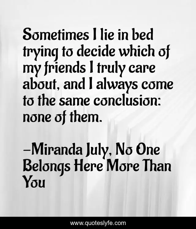This page presents the quote "Sometimes I lie in bed trying to decide which of my friends I truly care about, and I always come to the same conclusion: none of them.". Author of this quote is Miranda July, No One Belongs Here More Than You. This quote is about friends, friendship,.