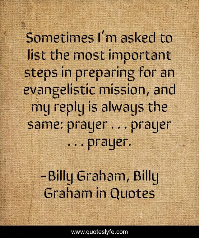 This page presents the quote "Sometimes I’m asked to list the most important steps in preparing for an evangelistic mission, and my reply is always the same: prayer . . . prayer . . . prayer.". Author of this quote is Billy Graham, Billy Graham in Quotes. This quote is about billy-graham, prayer,.