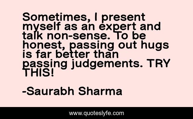 This page presents the quote "Sometimes, I present myself as an expert and talk non-sense. To be honest, passing out hugs is far better than passing judgements. TRY THIS!". Author of this quote is Saurabh Sharma. This quote is about judgements, acceptance, love, affection, hugs,.