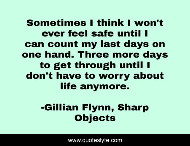 This page presents the quote "Sometimes I think I won't ever feel safe until I can count my last days on one hand. Three more days to get through until I don't have to worry about life anymore.". Author of this quote is Gillian Flynn, Sharp Objects. .
