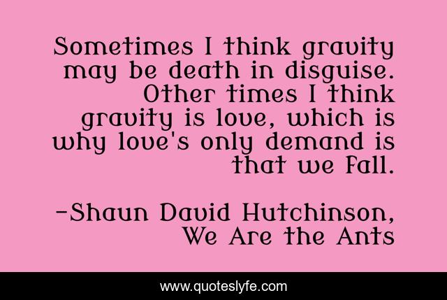 This page presents the quote "Sometimes I think gravity may be death in disguise. Other times I think gravity is love, which is why love's only demand is that we fall.". Author of this quote is Shaun David Hutchinson, We Are the Ants. This quote is about death, love, ya, aliens, gravity, teens, affection,.