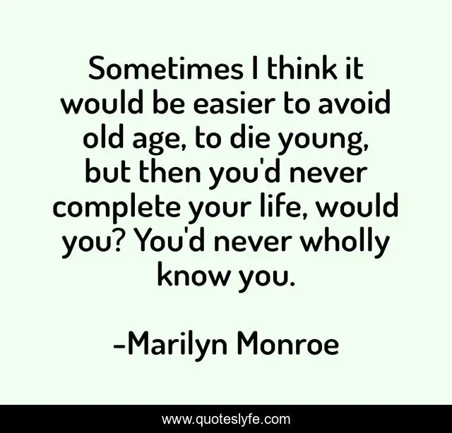 This page presents the quote "Sometimes I think it would be easier to avoid old age, to die young, but then you'd never complete your life, would you? You'd never wholly know you.". Author of this quote is Marilyn Monroe. This quote is about life, old age,.
