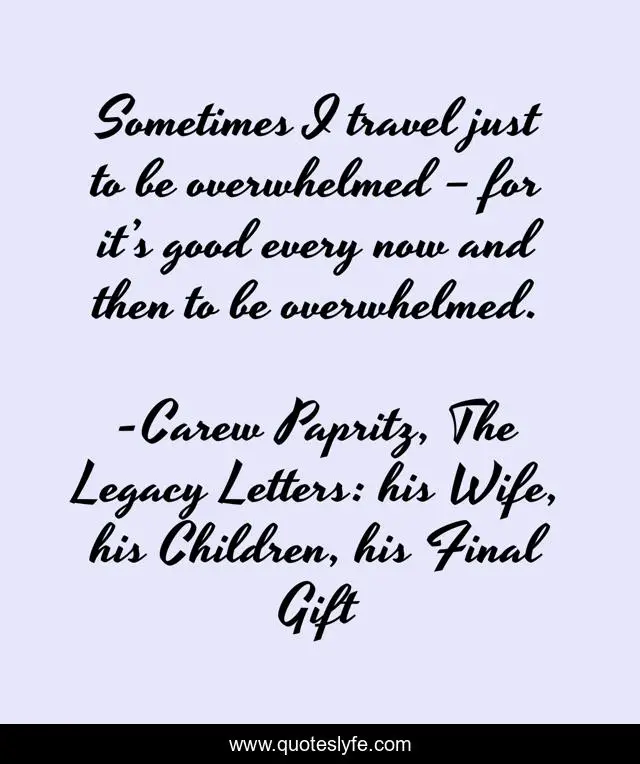 "Carew Papritz, The Legacy Letters: his Wife, his Children, his Final Gift Quotes." Quoteslyfe.com, 2025. Tue. 09 Dec. 2025. <https://www.quoteslyfe.com/quote/Sometimes-I-travel-just-to-be-overwhelmed-137350>.