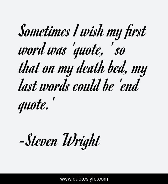 This page presents the quote "Sometimes I wish my first word was 'quote, ' so that on my death bed, my last words could be 'end quote.'". Author of this quote is Steven Wright. This quote is about wish, end, words,.