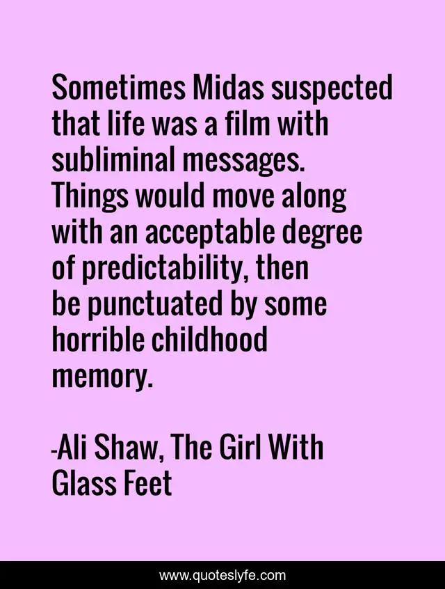 This page presents the quote "Sometimes Midas suspected that life was a film with subliminal messages. Things would move along with an acceptable degree of predictability, then be punctuated by some horrible childhood memory.". Author of this quote is Ali Shaw, The Girl With Glass Feet. This quote is about life, childhood, memory,.