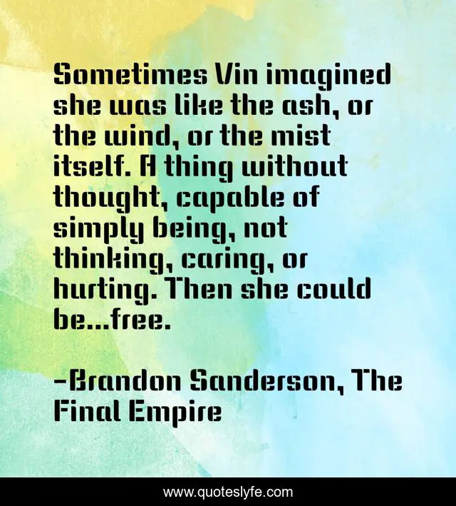 This page presents the quote "Sometimes Vin imagined she was like the ash, or the wind, or the mist itself. A thing without thought, capable of simply being, not thinking, caring, or hurting. Then she could be...free.". Author of this quote is Brandon Sanderson, The Final Empire. This quote is about just-be, quote, mistborn, the-final-empire, vin, free, brandon-sanderson, freedom,.
