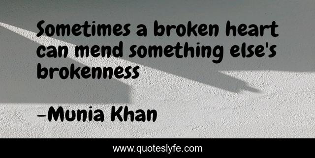 This page presents the quote "Sometimes a broken heart can mend something else's brokenness". Author of this quote is Munia Khan. This quote is about broken-heart, heart, aching-heart, brokenness, agony, sometimes, broken, heartbreaking, heartbreak,.