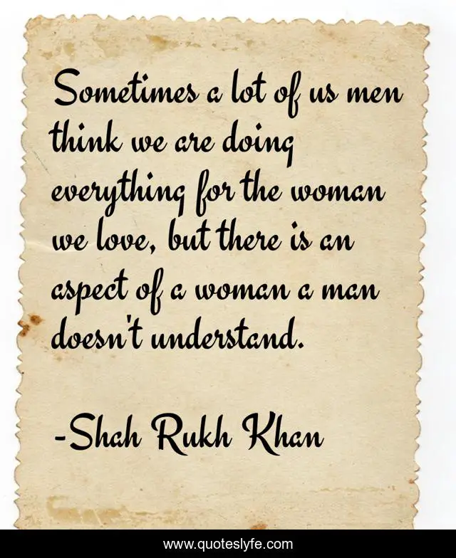 This page presents the quote "Sometimes a lot of us men think we are doing everything for the woman we love, but there is an aspect of a woman a man doesn't understand.". Author of this quote is Shah Rukh Khan. This quote is about woman, love, affection, man,.