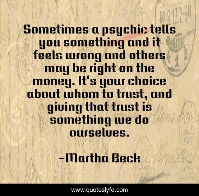This page presents the quote "Sometimes a psychic tells you something and it feels wrong and others may be right on the money. It's your choice about whom to trust, and giving that trust is something we do ourselves.". Author of this quote is Martha Beck. This quote is about giving, money, choice,.