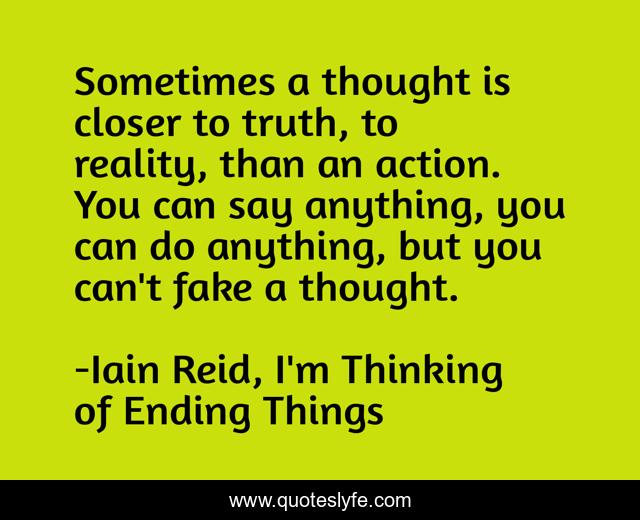 This page presents the quote "Sometimes a thought is closer to truth, to reality, than an action. You can say anything, you can do anything, but you can't fake a thought.". Author of this quote is Iain Reid, I'm Thinking of Ending Things. .